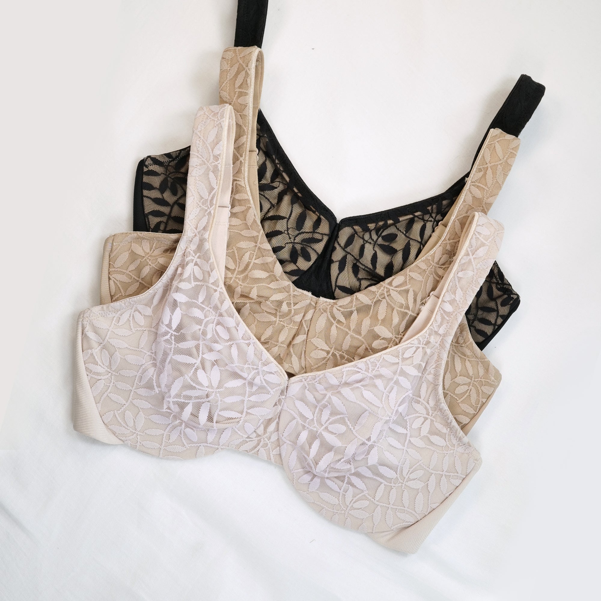 Comfort meets function in our Olga Sheer Leaves minimizer bra. It delivers a sleek silhouette and coverage you can count on under any outfit—plus lace detailing you'll love.