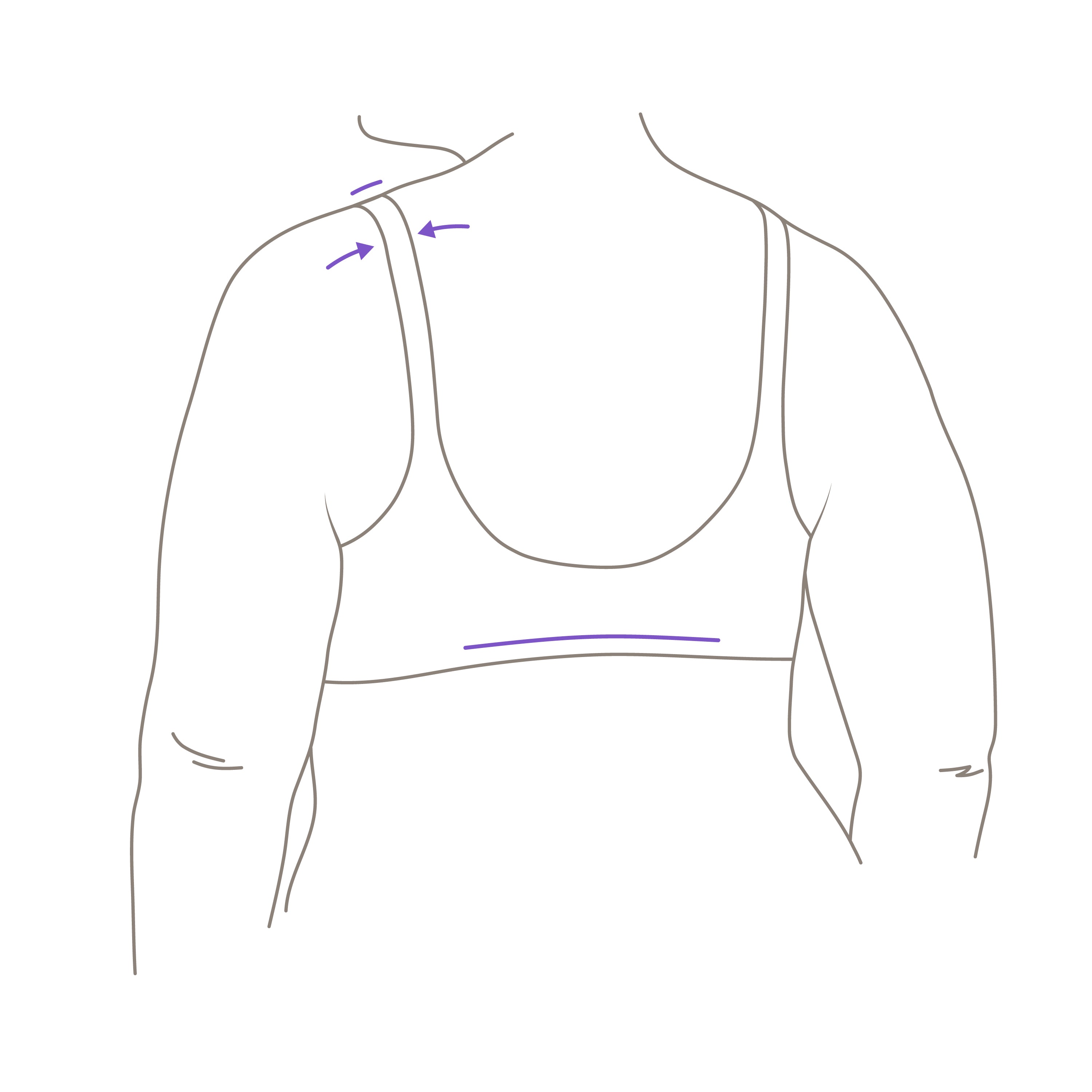 The bottom band should sit straight across your back—no riding up—and it shouldn’t feel too tight! Adjust shoulder straps to avoid digging or sliding.