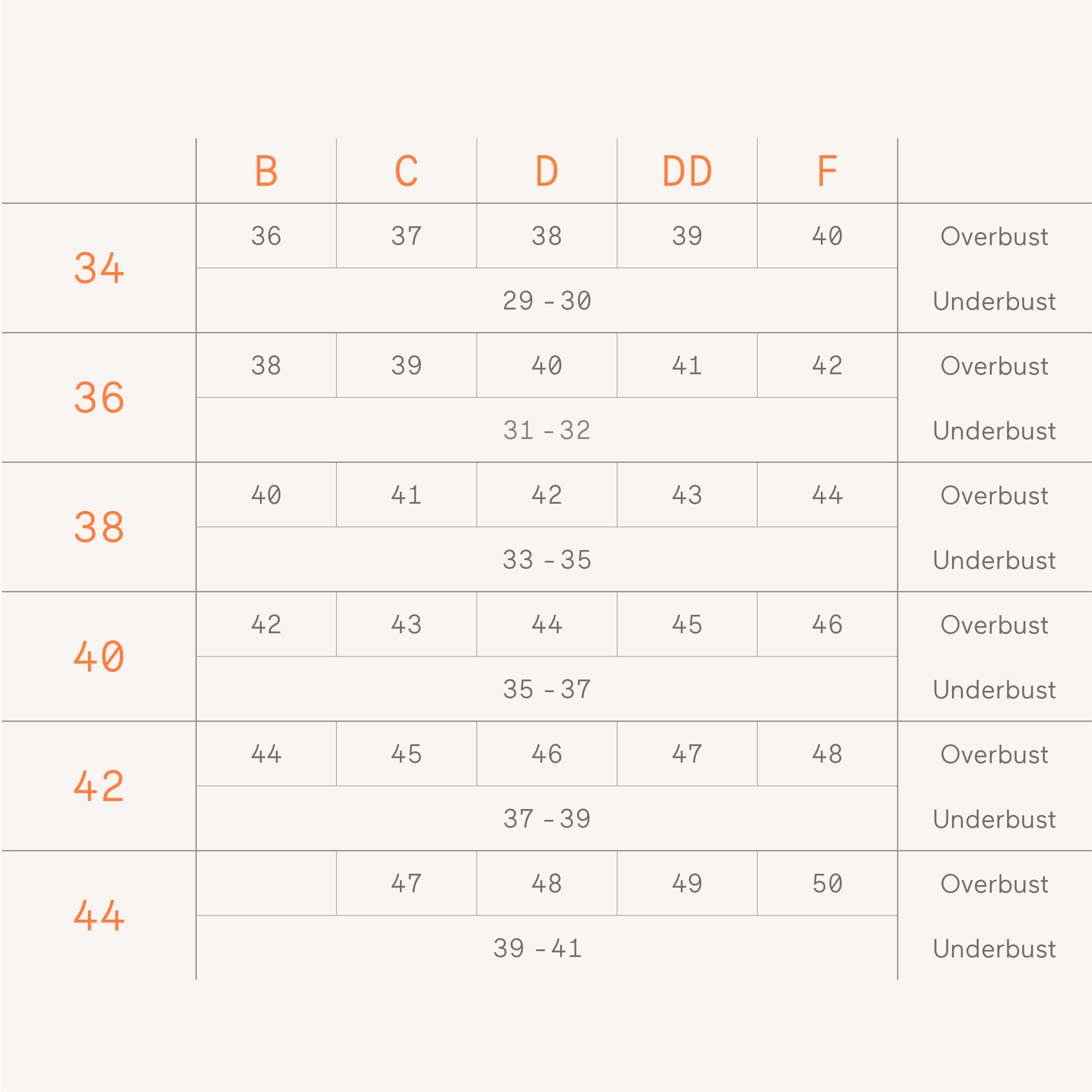 Using the measurements you just took, check our chart to find your band & cup size. Note: some variances in inches occur, so adjust for comfort.